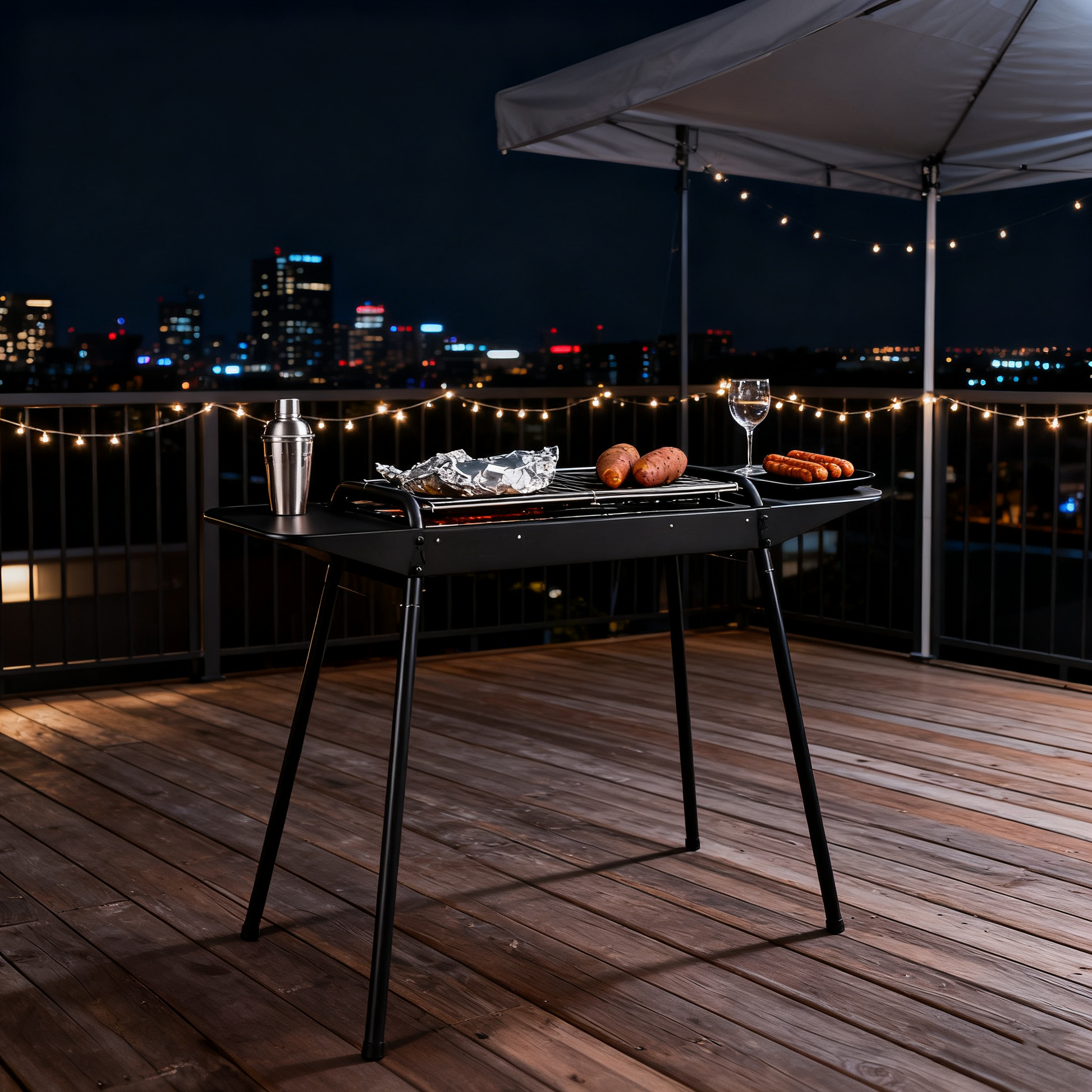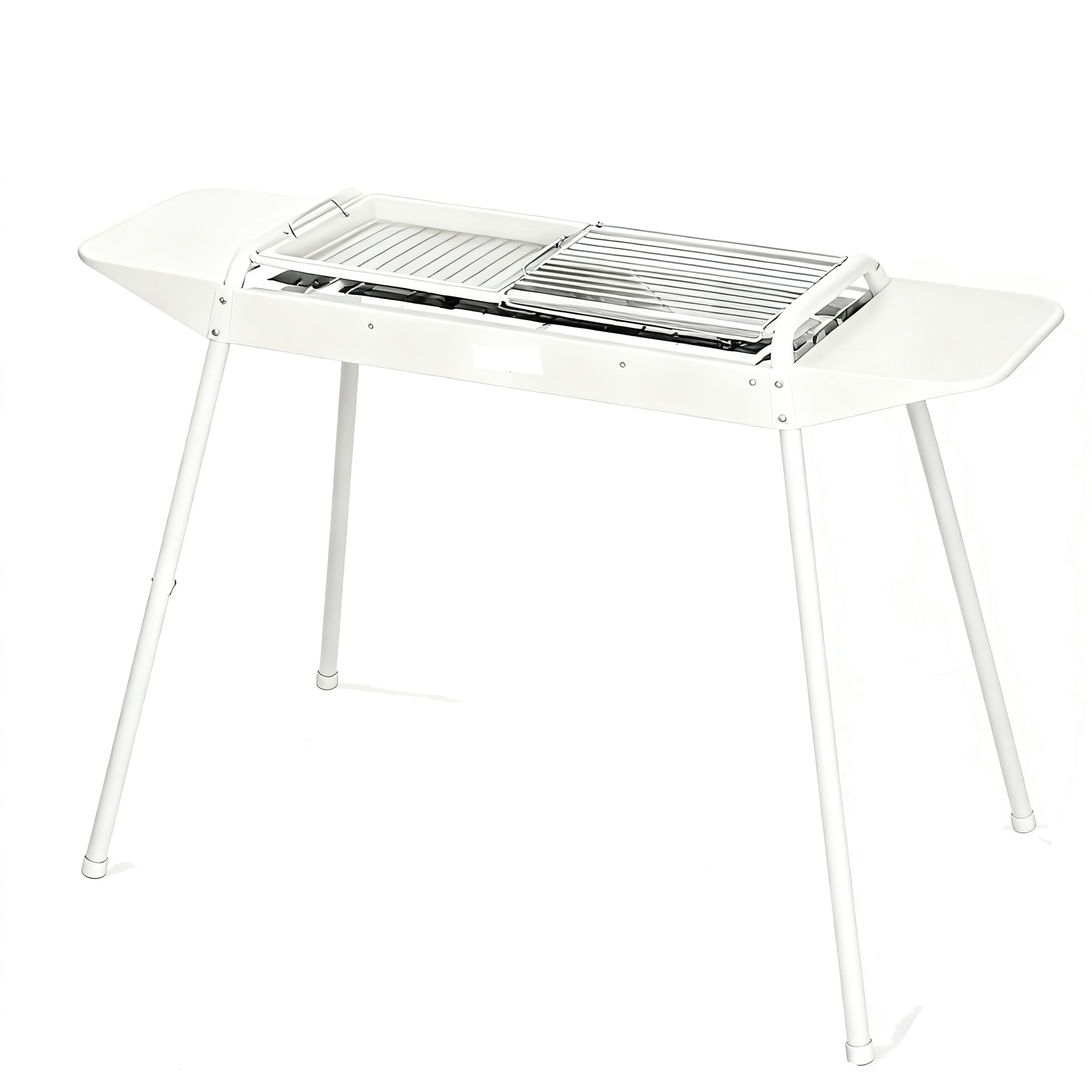 The grill is constructed from powder-coated, stretch-formed, electrophoresis-treated, stamped, and cold-rolled steel, providing durability, structural stability, and resistance to rust during regular outdoor use. An included grilling rack enables cooking a variety of foods, including meat, vegetables, and skewers.